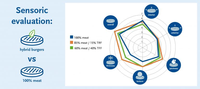 Replacing 15% (lean) meat with texturized rice flakes improves juiciness, texture and firmness compared to 100% lean meat. While replacing 40%* (lean) meat with texturized faba flakes also improves firmness and texture versus 100% lean meat. (*requires egg-white for binding)