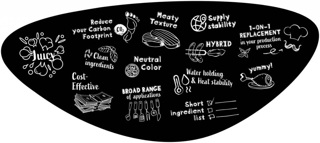 Our Meatless® ingredients are designed to enhance juiciness, texture and by doing so, the overall quality of hybrid and enriched meat. This provides you the competitive advantage in developing offers aligned with today’s consumer needs. With a focus on juiciness, the reduction of cost and carbon footprint while providing “better-for-you” alternatives, Meatless® ingredients enable a smooth production of all types of hybrid and enriched meat products.